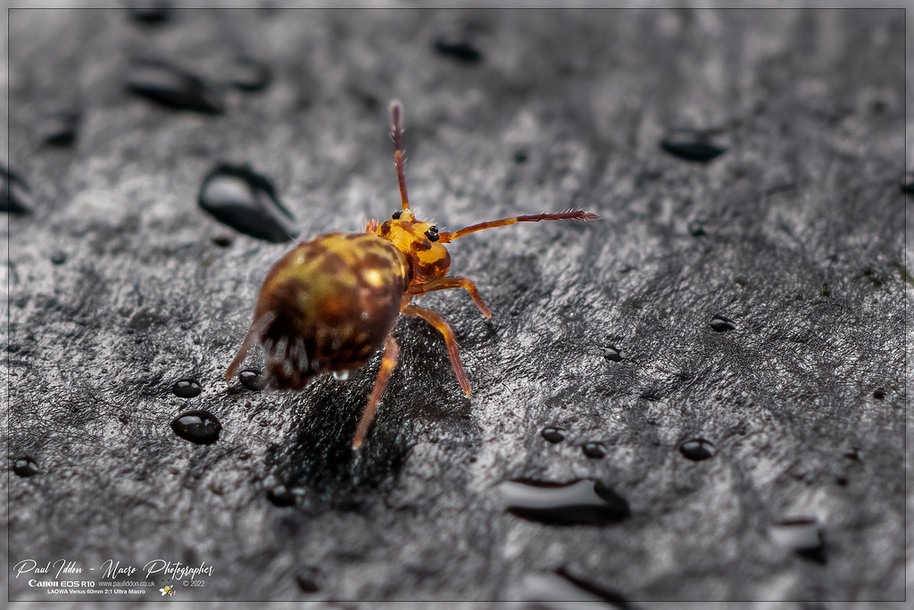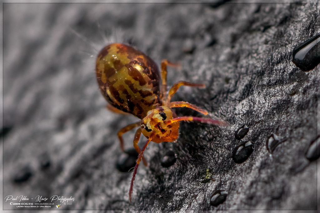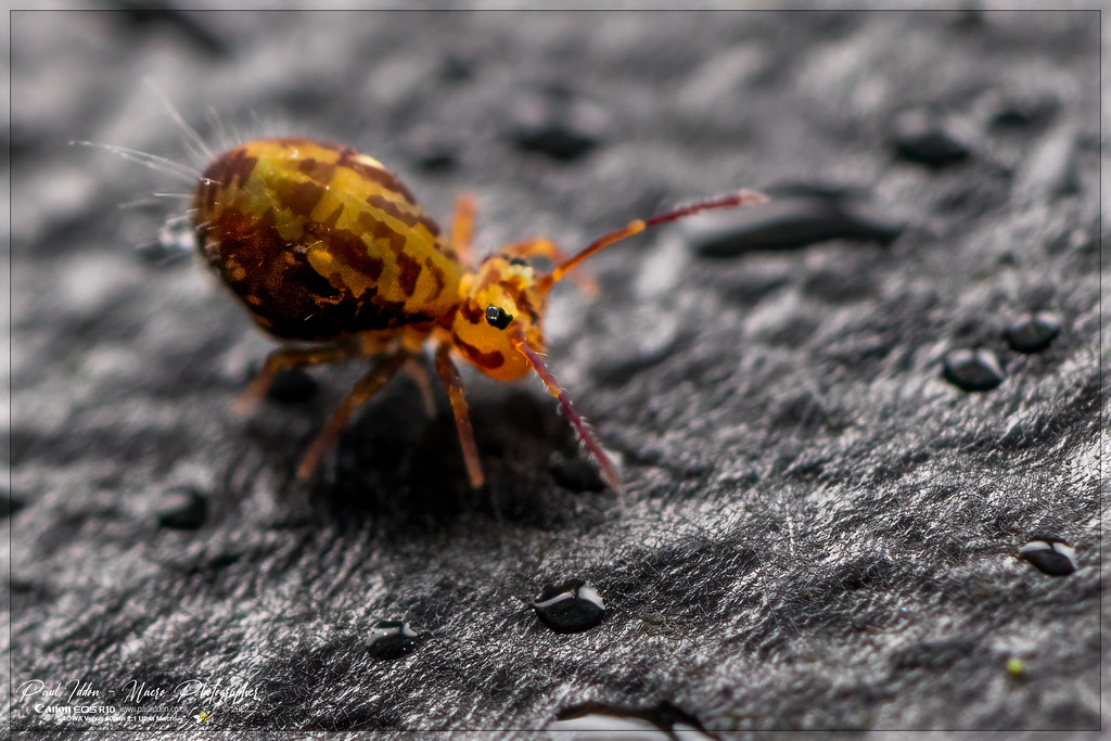 Like most, this globular springtail didn't want to sit still, but instead kept meandering around making it a pain to capture in the best pose... Dicyrtomina saundersi is a small globular springtail around only 2 or 3 mm. It has quite distinctive markings of pale greeny yellow and maroon.