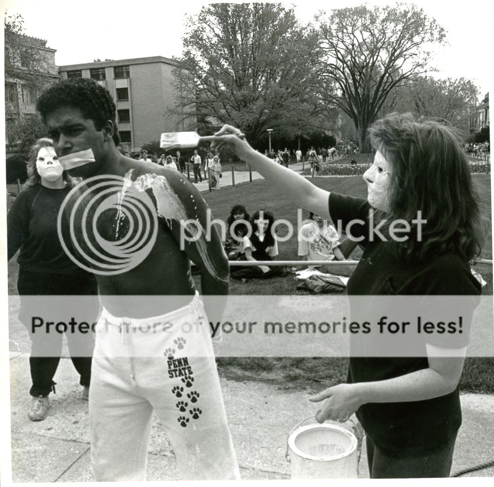 The news has been full of stories of the March on Washington, 50 years ago tomorrow. It got me thinking of this photo I took 25 years ago -- half way between then and now -- I've always called it Black Guy Being Painted White. It shows a group of drama students performing on the steps of Patee Library (Penn State). It was a completely silent production I think. I remember it was unannounced -- spot news. This photo ran on page one of the Daily Collegian on April 28, 1988. I wish I had the negative, instead of a fading print, and a yellowed piece of news print.