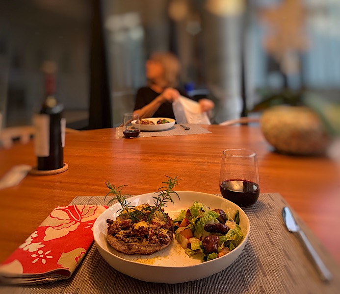 Recipe include vegetarian sausage, black beans, brown rice, red onions, garlic, Mariana sauce, sautéed for 15 minutes and then added to mushrooms on a pan in more marinara sauce and baked 380 degrees F, 30 minutes!